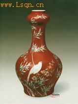 高21.7厘米、口径12.1厘米。 通体以珊瑚釉作地,以珐琅彩绘碧桃花和翠竹,腹和颈部各有一只小鸟,并有蜜蜂飞舞花间,显示出春意盎然、鸟语花香的意境。 胎质白且细,器面晶莹,外底有“大清雍正年制”青花楷书款。