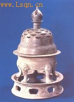 这件唐代越窑褐彩云纹镂花五足炉,高66厘米,口径36.5厘米,底径41厘米。胎体通施白色化妆土,上绘褐彩,表面施青釉,色泽青黄。器身由盖、炉、座三部分组成。盖形似头盔,顶作含苞待放的荷花钮,顶端中央有一圆孔,与器内相通。钮缘有镂花八组,钮座作竹节颈托盘。盖缘镂刻交叉云纹四组。炉作外折宽平沿,筒形腹,平底,下有五条虎首兽足,虎额上均印有“王”字。座为环形须弥座,作上下口,上口沿平而外侈,束腰,座底外撇。腰部周缘镂雕八个壶门。从盖钮到台座,均用褐彩绘有如意、云气等八组图案,每组纹饰都以双弧纹相间。造型、彩绘与镂雕融为一体,有虚有实,疏密有致,给人以庄重大方,清新舒畅之感。