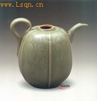 高16.5厘米、宽12.4厘米、口径3.5厘米、底径8厘米。 此把南宋早期龙泉窑瓜棱壶是少见器型之一,细长的流,保留着北宋盘口壶的长流特点,颈和上口已经全部缩成一圈。壶身釉色青翠,四周的瓜棱是拉坯成型后刻出的,这也是北龙泉窑瓜棱盘壶的共同点,壶身布满到花花草图案。但与南宋中、晚期那滋润如玉般的釉色相比,尚显单薄。