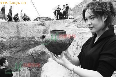 在发掘现场,记者看到,有十余件刚挖出来的陶器已经编号放入塑料袋,并运出墓坑,部分考古人员还在墓坑内根据随葬器物的原始摆放位置标出相关示意图。在古墓中还裸露着一些陶器的表面,安徽省文物考古研究所的专家嘱咐工作人员小心挖掘。记者看到,出土的陶罐外观为青黑色,上面有横向绳纹。有些陶壶和陶罐造型别致,底呈圆形。这批陶器大多体型较大,大部分保存非常完整,初步确定是距今约四千年的龙山时期陶器。