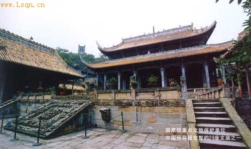 富顺文庙自北周武帝天和二年建县至北宋初年(567-960)的近400年间,由于地处边陲,僚汉杂居,盐业虽盛而文风未开。宋仁宗景祐三年(1036),朝廷选派太常博士名学者周延俊来富顺任知监,努力兴教化,办学校,培育士子。在他任职的第六年,即庆历二年(1042),富顺县终于出了第一个进士-李冕,全县士民无不欢欣庆幸。在周延俊的倡导下,人们集资于庆历四年(1044),在县城中心的南门,建成一座文庙,主供孔子,时称"文宣网庙"。并在庙内立石质"雁塔碑",以刻全县历次中试者的名字。此后,历任富顺知监,均热心教育事业,亲任儒学教授,常在从政之余,来庙内为生员讲课,于是文风大开。宋代在雁塔刻名的进士即有67人之多。