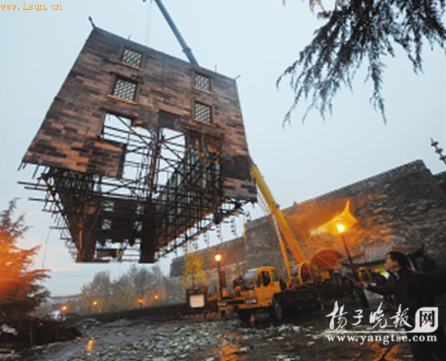 从昨天上午8点起,在蒙蒙冬雨中,南京中华门城堡上的3座仿真绞闸楼开始拆除,至晚上7点多,总重24吨的绞闸楼钢架结构全部被吊下城楼,并被现场工人冒雨分拆。据介绍,绞闸楼又称镝楼,在600多年前的明代,是保护“绞关”的建筑。2年多前,中华门城堡为配合灯会需要,仿真再现了明代绞闸楼并安装在城堡之上,现因破旧导致雨雪天出现安全隐患,这才决定拆除。