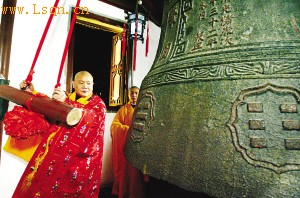 记者昨从苏州市旅游局获悉,一年一度的寒山寺除夕钟声即将敲响,与往年不同的是,今年12月31日晚,网民还将发起一场网络传递寒山寺钟声活动。从寒山寺住持在钟楼上敲响第一声钟声起,网友即可通过QQ群传递钟声,首先由苏州向江苏省内各城市传递,继而传向全国。据了解,本次网上敲钟活动将延续到2010年1月1日。图为该寺僧人在敲钟。新华社发