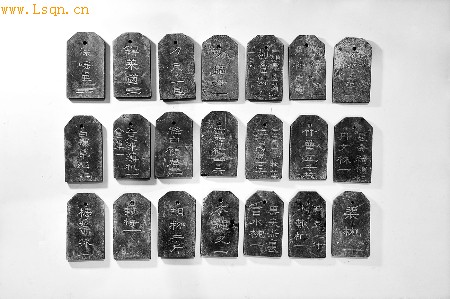 共出土刻铭石牌59件,有长方形、圭形等,铭文记录了随葬物品的名称和数量。其中8件圭形石牌极为珍贵,分别刻有“魏武王常所用格虎大戟”、“魏武王常所用格虎大刀”等铭文。在追缴该墓被盗出土的一件石枕上,刻有“魏武王常所用慰项石”铭文。这些文字材料为研究确定墓主身份提供了重要的、最直接的历史学依据。
