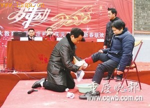 近来,丰都县城的人们纷纷议论着这样一件事:位于丰都县城丁庄码头的星火学校校长,在全校的家长会上,当着1200名教师、学生和家长的面,给母亲下跪洗脚。有人认为,该校长纯属作秀;有人觉得,校长为人师表,以身示范教育学生孝敬父母,学会感恩,值得称道。 事情原委到底如何?校长为何有此举?昨日,本报记者就此展开调查。 惊人一幕 校长在家长大会上为母洗脚 昨日,学校老师范岚岚向记者讲述了12月31日事件发生的那一幕。 “当时,学校正在操场举行一年一度的家长大会。在教导主任等人讲话完毕后,校长郑天云上台总结发言。在说了学生管理、家庭教育等问题后,他话锋一转,谈到一些学生不懂孝顺的事情……” 当时,1200多名教师、学生和家长正聚精会神地聆听着校长郑天云的讲话,意外的是一位衣着朴素的农村老太太登上了讲台。 “她是我的母亲!”郑天云将老人扶到台上的椅子上坐下,“2010年到了,你们送给父母什么新年礼物呢?” “我的礼物是今天为母亲洗一次脚!”突然,郑天云扑通一声跪在母亲跟前,将水瓶的水缓缓倒入脚盆,接着扶起母亲的左脚,取下鞋子,轻轻地脱下袜子,用手指伸进脚盆里探了探水温,双手捧起老人的左脚,放进了脚盆,腾出双手又扶起母亲的右脚。 台下,一片寂静,校长突如其来的举动让大家为之一愣,纷纷提臀翘首,张着嘴巴,目不转睛地看着跪在台上的校长为母亲精心地洗脚。 “你入学的新书包有人给你拿,你雨中的花折伞有人给你打……”伴随着《母亲》动人的旋律,郑天云左手托起母亲的左脚,右手掬起热水,流过脚背、脚板,双手不停地揉捏、抚摸着母亲的脚。看着郑天云,老人慈祥地笑了。 “父母为了我们成长日夜操劳,他们的头发白了,脸有皱纹了,甚至还衣衫褴褛,我们有的人看不起父母了,不愿他们出现在同学面前,不愿同他们说话。其实,他们也想穿好、吃好,可这一切都是为了我们能吃好、穿好,学习好啊……”郑天云一边为母亲洗脚,一边通过麦克风告诉台下的孩子们。 台下,高一年级八班的胡维维落泪了,有的学生脸红了,有的低下了头。 各有说法 有人感动有人说是作秀 学生巧明(化名)母亲是个聋哑人,父亲在县城做苦力。他告诉记者,那天他没有通知父母来开家长会,因为之前父亲满身汗气到学校给他送生活费,让他感觉在同学面前抬不起头来。如果让同门们知道母亲是个聋哑人,自己肯定会没面子。那天看着郑校长为母亲洗脚,巧明突然认识到,父母为了自己成长,比别人付出得更多更艰辛,而自己却看不起他们。他告诉记者,父亲很辛苦,母亲又行动不方便,自己要多做家务,减轻他们的负担。 “不仅教育了孩子,还教育了我们。”陈学良的女儿念高一,那天他也参加了家长会。他说,郑校长的举动,不但教育了女儿,还让他想起乡下的父母。陈学良告诉记者,只有自己孝敬父母,女儿也才会有感恩的心。该校高一一班班主任范岚岚称,在校长的感召下,当时很多学生都向自己的父母下跪感恩,并为过去不懂事表示了忏悔。 也有一些人对此有不同看法。“像是作秀。”在丰都县城经营百货生意的李俊义认为,郑天云的举动太夸张了,为母亲下跪洗脚给人有点沽名钓誉的感觉,除了赚取眼球炒作自己和学校外,指望一场为母亲洗脚的表演唤起孩子感恩的心,也似乎太简单了。78岁的张林华大爷说,郑天云在考虑培养孩子感恩的心时候,不知想到过母亲的感受没,寒风中,让母亲在众目睽睽下,坐着让你洗脚,当心让老人伤了身体又伤了心。