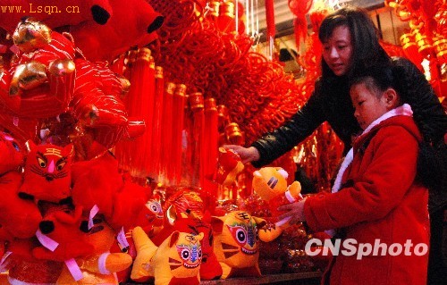 近日,农历虎年春节日益临近,重庆街头虎年年味也日渐浓郁。在重庆一小商品批发市场,以“老虎”为主题元素的玩具、挂件、窗花、对联成为年前的热销商品。中新社发 胡虹 摄