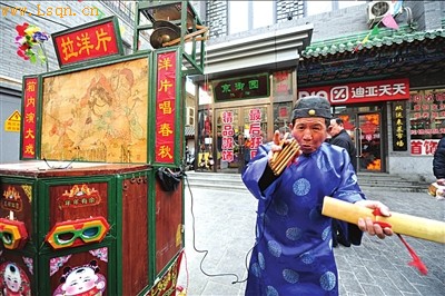 日前,老人在大栅栏表演拉洋片。本报实习记者 杨天啸/摄