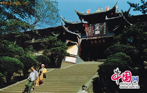二王庙古建筑群是世界文化遗产都江堰的重要组成部分,位于岷江东岸的玉垒山麓,是为纪念都江堰的开凿者、秦蜀郡太守李冰及其子二郎而修建的。二王庙初建于南北朝,现存建筑系清代重建。庙内有李冰和二郎的塑像,石壁上嵌有李冰以及后人关于治水的格言,被称为治水三字经。后殿右侧有画家张大千、徐悲鸿等人的碑刻。园中植满各种名贵花木,古木参天,林荫蔽日,是四川的游览观光胜地。