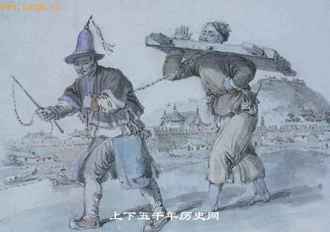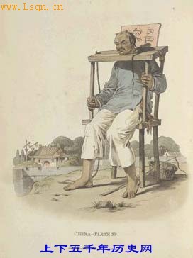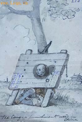 在中国“比较多的处分是罚款、坐牢、鞭挞和充军。危害国家、冒犯皇帝、或乱伦的罪行不得减免处分。误杀和谋杀的案件没有多大区别。窃盗和抢劫,除杀伤物主而外,都不判死刑。……在死刑中,绞死的处分比杀头轻。中国人认为身首异处是一件特别可耻的事。有一种刑罚称为‘枷’,是对轻微罪刑的处分。方法是把一块大木头中间挖一个洞,套在犯人颈部,另挖两个小洞套住犯人两只手。它是一种固定的适于步行的枷,犯人可以被枷几个星期或几个月,假如体力能支持,犯人带着枷仍然可以走动。但他们经常倚在墙或树上,这样可以减轻身上负担。看管犯人的,如果认为他们这样休息时间过长了,就用鞭子打他们,叫他们站起来。”