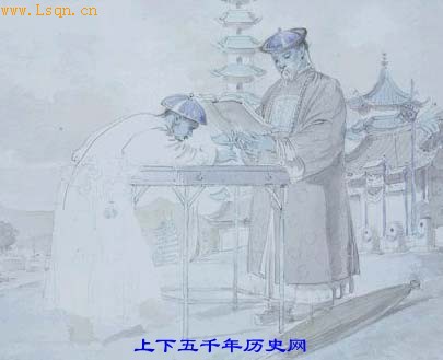 中国人用毛笔和印度墨水写字。笔是垂直拿的,字也是从一页纸的上边垂直写到下边,而且是由左写到右。衙役所戴帽子上的明显字迹,表明的他是哪家听差的。