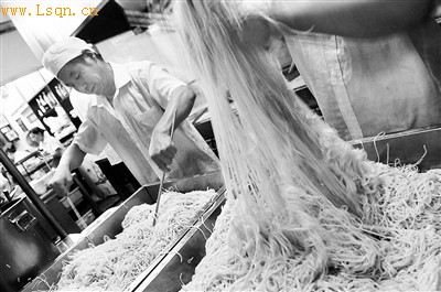 图为在新街口新川面馆,后厨师傅正在将刚过油的面催凉摄/时会理