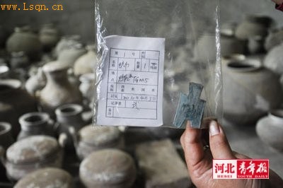 另外,李军还展示了一个布满铜锈的布币。他说:“墓群中出土的多为五铢钱币,布币的发现将墓群的年代定位进一步提前。同时,出土的还有铜带钩、铜铃等。由于墓穴众多,并在不同时期墓穴内出土了代表性的器物,这对研究邢台地区乃至河北境内战汉时期的丧葬习俗、社会生活及墓葬分期将起到标尺的作用。”