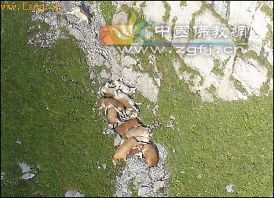 根据当地村民拍下的照片,悬崖下是一只只死牛的尸体。当地村民说,这些牛都是在短短3天时间里相继跳下数百米高的悬崖“自杀”的。当地警方调来直升机,将死牛的尸体吊离,以免污染地下水。