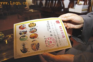 记者随后联系上了刘女士。她告诉记者,昨天上午10点左右,她一个人在家收拾家务,听到有人敲门,发现是一位“僧人”。“僧人”称,农历二月十九日是观音菩萨生日,他代表鸡鸣寺前来化缘,并随手递上了一张被“开过光”的佛像和一串佛珠。刘女士是信佛之人,收下后正准备表示感谢,对方却随手递上了功德簿,希望刘女士多少也要表示一点,刘女士瞄了一眼,发现起步价就是28元。刘女士有些起了疑心,随手将身上几元零钱掏给了化缘的“僧人”,对方还嫌少,刘女士就更加怀疑了,于是打电话到鸡鸣寺询问,心想如果真有化缘募捐一事,就多掏一点香火钱,谁知刘女士电话还未打通,回头一看,“化缘僧”早没了踪影。