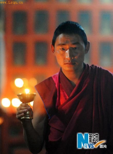 塔尔寺一名僧人在经堂内手持酥油灯
