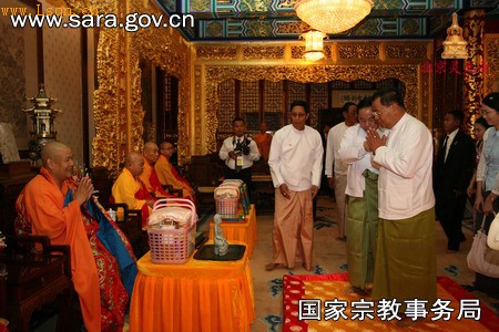 中国佛教新闻网讯 9月8日上午,应胡锦涛主席邀请来华访问的缅甸联邦国家和平与发展委员会主席丹瑞与夫人一行赴灵光寺参拜佛牙舍利,在外交部、我局及中国佛协的指导下,灵光寺方丈常藏法师率灵光寺四众弟子予以热烈欢迎和热情接待,活动进展顺利圆满。