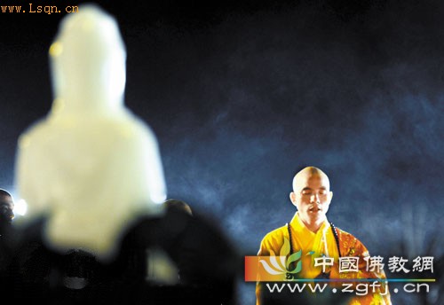 21时许,白马寺方丈印乐大和尚率众僧举行了隆重的拜月祈福仪式。在嘹亮的诵经声中,众僧次第跪拜于佛祖像前,为天下众生祈福。
