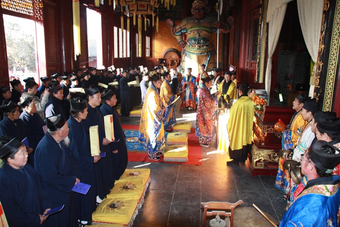 本网讯 2009年冬至日,河南省道教界全真派冠巾大典在中岳庙举行。来自全省各地道教宫观骨干86人参加了培训并授冠,中岳庙住持黄至杰道长任冠巾大师。中岳庙经师班15人举行了冠巾大典法会。