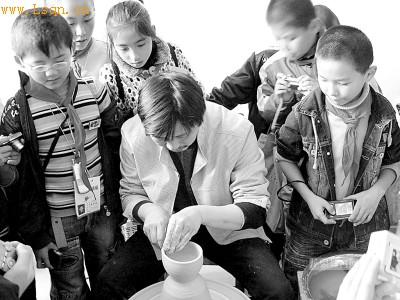 当地小学生们在参观龙泉青瓷技艺展示。东升摄