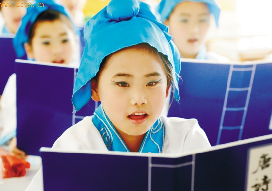 12月4日,沈阳市浑南新区第三小学举办了一场名为“诵唱经典国学”的活动,学生们以古装扮相,朗诵古代诗词。据学校负责人介绍,该校设立了内部“古诗词六级”,每学期可以考两次,学生经考试合格,毕业时能拿到由学校颁发的“古诗词六级”证书。 记者 李浩摄