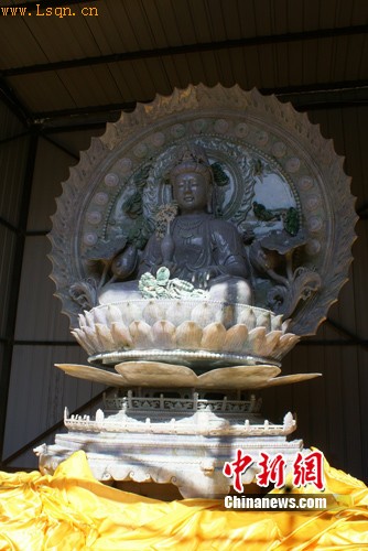 中新网陕西铜川3月11日电(贺向前 连莲)为纪念唐玄奘圆寂1347周年,一座高4米30多吨重的翡翠玉观音9日(农历二月初五)被安奉在唐玄奘圆寂地陕西铜川玉华宫,包括当地政府、宗教界等各界人士千余人参加了安奉仪式。