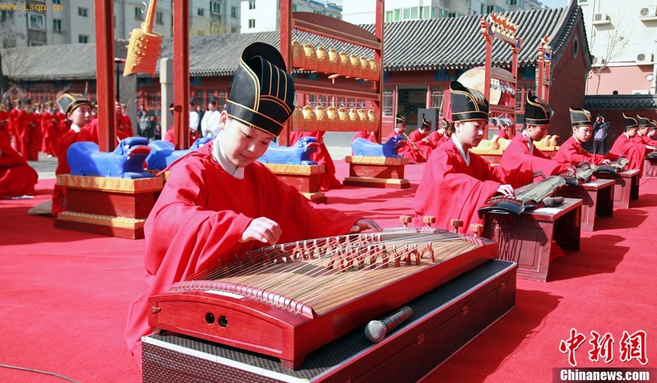 3月23日,河北省正定县文庙,弦歌阵阵,雅乐齐鸣,民间人士及孔氏后裔近300人用传统的“释奠礼”隆重纪念至圣先师孔子。据河北省释奠礼活动发起人、河北省人大常委高士涛介绍,今天是夏历二月的第二个丁日,也是传统春季祭祀孔子的日子。在古代,祭孔活动被称为“释奠礼”, 礼、乐、舞并全,是中国祭祀文化一部分,彰显了中华文化特有的礼乐文明。图为在庄严肃穆、中正平和的礼乐声中,祭孔传统礼仪——释奠礼正式拉开帷幕。 中新社发 翟羽佳 摄