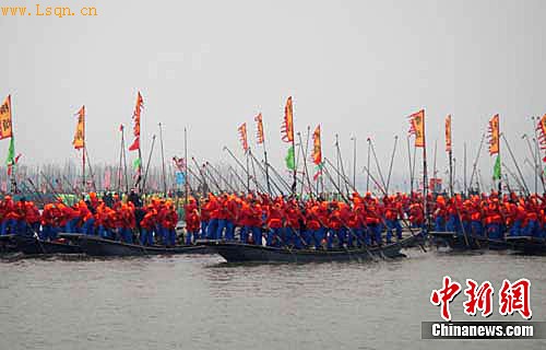 中新网姜堰4月6日电(周胜涛 黄立群 刘永彬 孔纬)4月6日,一年一度的水乡会船活动进入集中表演、比赛时段,把第六届中国湿地生态旅游节暨''2011中国姜堰8226;溱潼会船节全面推向高潮。500多条各式各样的船只和2万余名会船选手飞篙走桨,弄潮击浪,数万中外游客相聚溱湖共赏湿地风情和“天下第一水上庙会”的壮观场面。