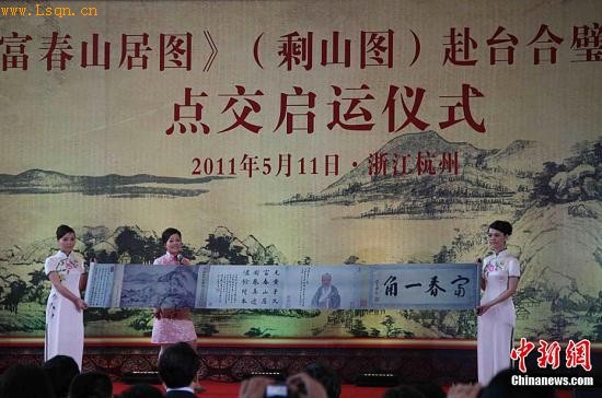 5月11日,《富春[注: 富春乡-鄄城县富春乡地处鄄城县城南郊,辖17个行政村,52个自然村,3.4万人,4.2万亩耕地,临(清)商(丘)公路纵贯全境,]山居图》(剩山图)赴台合璧展览点交启运仪式在浙江省博物馆武林馆区举行。作为浙江省博物馆镇馆之宝的《富春山居图》(剩山图),这是第一次离馆赴境外展览。图为浙江省博物馆讲解员讲解《富春山居图》。中新社发 汪恩民 摄