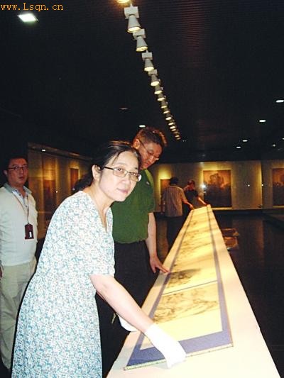 昨日上午,记者闻讯赶到省美术馆三楼的布展现场。只见省美术馆馆长、著名书法家孙晓云等人正戴着白手套,把长10米有余的高仿版《富春山居图》小心摆放到15米长的展台上。孙馆长兴奋地告诉记者:这在江苏南京[注: 南京市-南京,简称宁,别称金陵,是中华人民共和国江苏省省会、副省级城市,“中国四大古都”之一,有“六朝古都”之称。南京位于长江下游沿岸,]堪称首家拥有并首次展出。