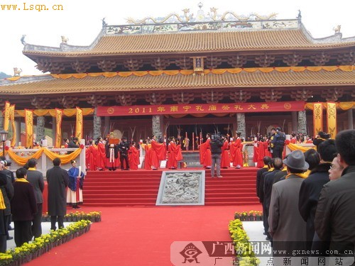 南宁孔庙始建于北宋皇祐年间(1049-1054),原来在市内仓西门外沙市(今新华街水塔脚附近),南宋宝庆三年(1227)迁至南宁饭店处。南宁孔庙从始建到民国初期,历经3次迁建。清末以来逐渐倾圮,只剩大成殿。1982年,因扩建南宁饭店,终将旧孔庙拆除。拆下来的建筑材料[注: 在建筑物中使用的材料统称为建筑材料。新型的建筑材料包括的范围很广, 有保温材料、隔热材料、高强度材料、会呼吸的材料等都属于新型材料。]保存于广西展览馆。2007年5月南宁孔庙迁建主体工程开始建设,至2011年1月30日迁建落成,历时3年多。新落成的孔庙,是现今广西乃至岭南地区规模最大的孔庙之一。