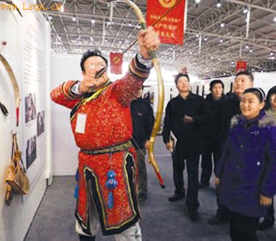 身穿鲜艳的锡伯族传统服饰[注: 传统服饰是反应过去时代文化和人们对地域环境影响下形成的文化标志之一。中国传统服装有两种基本形制,即上衣下裳制和衣裳连属制。],足蹬短帮靴,本就身材魁梧的伊春光,显得更高大了。他背后的一整面墙上,挂满了大大小小、形形色色的弓。“冬天下料,春天刨牛角,夏天制筋,到秋天把它们组合起来,做一把弓要操心一年多。”他说。在“中国非物质文化遗产[注: 文化遗产,中文在概念上分为“有形文化遗产”和“无形文化遗产”。“有形文化遗产”即传统意义上的“文化遗产”,根据《保护世界文化和自然遗产公约》 (简称《世界遗产公约》),]生产性保护成果大展”的这几天里,伊春光忙,忙得不亦乐乎。