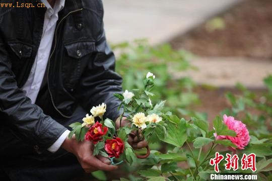 4月27日,面塑爱好者在洛阳国家牡丹院内展示各色面塑牡丹。 巩卫东 摄