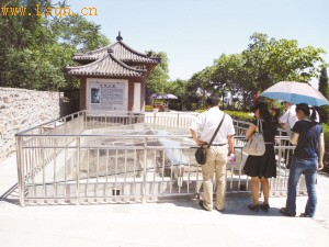 昨日(7日)上午,在满城陵山汉墓,记者在中山靖王刘胜墓的右前方看到,在玻璃罩和不锈钢围栏保护中,这个建筑回填坑吸引了不少游客。
