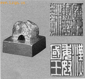 《后汉书[注: 《后汉书》-《后汉书》是一部记载东汉历史的纪传体史书。书中分十纪、八十列传和八志(司马彪续作),记载了从王莽起至汉献帝的195年历史。]·光武帝[注: 汉汉光武帝(公元前6年—公元57年)即刘秀,南阳蔡阳(今湖北枣阳)人,东汉王朝开国皇帝。新末天下大乱,刘秀与兄在舂陵起兵,并以“复兴汉室”为号召,与众豪杰并争天下。]本纪》和《后汉书·东夷传》中记载“建武中元二年(公元57年)倭奴国奉贡朝贺,使人自称大夫,光武赐以印缓。”这枚金印后来不知所踪,直到1784年,才在九州的福冈,由名叫秀治和喜平的二位佃农,在耕作挖沟时偶然发现。金印印面正方形,边长2.3厘米,印台高约0.9厘米,台上附蛇形钮,通体高约2.2厘米,上面刻有“汉倭奴国王”字样,清晰的说明了倭国是汉朝的附属,是中日外交史上最珍贵的文物。