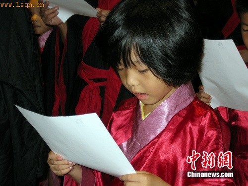 图为参加入泮仪式的孩子在朗读弟子规。李晨韵 摄