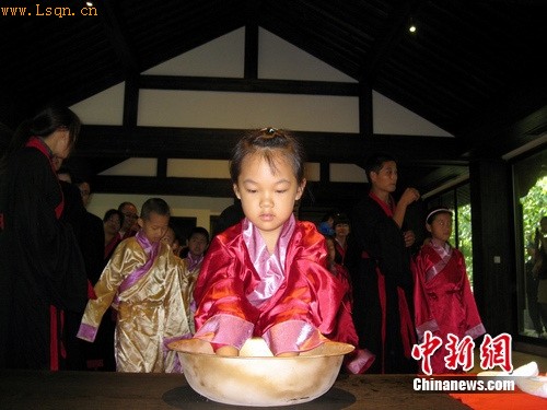 “我觉得很快乐。”在完成“净手礼”后,即将升入小学的黄俊杰告诉中新网记者,这次活动非常有意思。“穿古人穿的衣服,感觉就像穿越了一样。”