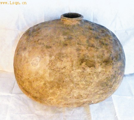 昨日,记者从省文物局获悉,陕北地[注: 北地,指中国古代地名北地郡,其地域大致在今陕西、甘肃、宁夏一带(详细情况请参看词条“北地郡”)。-beidi]区首次发现一件巨型汉代茧形壶。这个壶是从村民家征集到的,壶身一侧刻有罕见阳刻(凸型)图案。