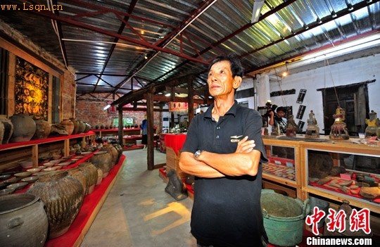 在海南省乐东黎族自治县黄流镇,有一家名叫“白沙河谷”的私人博物馆,馆内收藏着3000余件老物件,从新石器时代[注: 新石器时代(Neolithic Period)指以使用磨制石器为标志的人类物质文化发展阶段。年代大约从1万年前开始,结束时间从距今5000多年至2000多年不等。]的磨制石器到近代海南黎族生产生活用具,特别是黎锦龙被、鹿皮画、青铜蛙锣、男根、黄花梨、鹿皮鼓等海南黎族文化的标志物让人目不暇接。博物馆的馆长是退休邮电职工63岁的袁金华。图为老袁在自己的博物馆中欣赏着自己的藏品。中新社发 骆云飞 摄