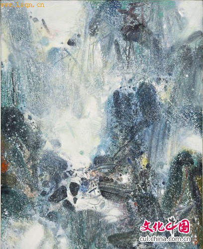 《雪之万象》(估价1,000万至1,600万港元)则为抒情抽象画派代表朱德群完成于1985年的雪景系列经典。他以独特的泼洒技法,展现眼见大雪纷飞的美景时内心的感动与激荡,在既有充满韵律并带有东方书法笔势的笔扫线条构成上,他以大笔沾颜料,配合身体的律动与呼吸,藉由波、甩、点、洒的功夫,创造了此层次丰富的盛美之景。在那直立的画布之上,峰峦层迭的雪山如悬瀑般交错矗立;淀积丰厚的白雪在白色光线的折射下璀璨生辉,而雪花霜霰漫天,若在回旋的气流中为观者呈现一场大自然的盛美之舞。而画面中粉紫色的梦幻光彩,既似极光,又似生命的灵动,洁净沁人,展现着希望满溢之境,与物我两忘的天人合一。有形的自然之美在此幻化为抽象的景物,朱德群邀请观者与其共游于天地之间。