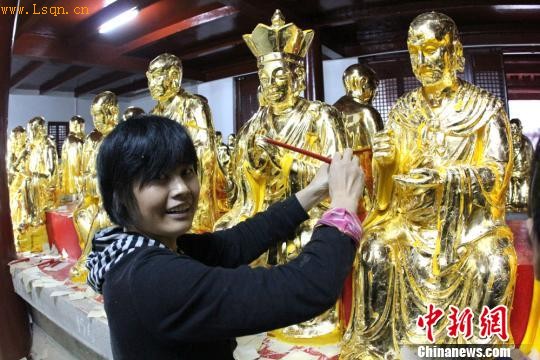 当阳玉泉山民间艺人正在为五百罗汉塑金。 朱正明 摄