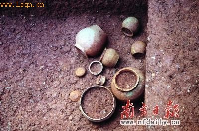 本次发现的南越国墓面积最大,为长方形竖穴木椁墓,在本次发现中年代最早。该墓墓底层铺有厚约3厘米的细小石子,估计用于防潮,做工繁复精细,是当时流行的典型特色。由于该墓没有被盗,因此随葬器物最多,有瓮、盒、盂、罐、缽等。