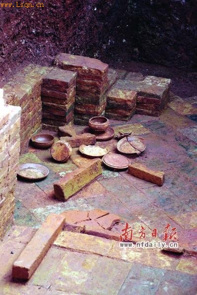 尽管由于墓葬多次被盗,存留的物件不多,甬道和券顶都遭到严重破坏,但墓穴的规模已足显主人身份。该墓残长8米,可谓南朝墓中的“豪华别墅”。而且从墓葬的残存部件可见,原来砖室的上部还有精心打造的“T字型”饰件,象征墓主囊括天地于一室的气势。据专家考证,由于广东在南朝时期经济发展[注: 概念 一个国家摆脱贫困落后状态,走向经济和社会生活现代化的过程即称为经济发展。经济发展不仅意味着国民经济规模的扩大,更意味着经济和社会生活素质的提高。]比较稳定,而且民风崇尚厚葬,因此墓葬一般规模较为宏伟。