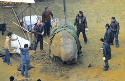 吊车帮忙石兽上午“正身”