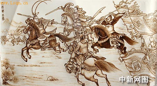 中国人物画《三英战吕布[注: “三英战吕布”是我国古典名著《三国演义》中一个精彩的故事情节,出现在第五回中,该片段以刘备、关羽、张飞兄弟三人与猛将吕布的殊死战斗为描述对象,描绘了一场酣畅淋漓的沙场血拼。]》