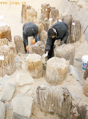 考古人员正在清理秦汉渭桥厨城门遗址一号桥桥桩和石构件。(记者 李明 实习生 康楠 摄)