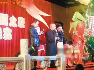 郭德纲圣诞夜“天价相声”已经说了七年,最高票价为8800元。图为郭德纲(中)正在台上抽取幸运观众