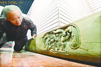 近日,在汉阳区江堤街江欣苑社区,民间工艺美术家刘泥巴(本名刘国瑞,以一手捏泥人绝技得此称号)向记者展示了这根雕花大梁,木料为坚硬岩杉,约4.6米长,寓意“事事如意,六六大顺”。据估测,大梁重约五六百斤。大梁两端分别刻有祝寿及三贤人物木雕。木雕中,既有栩栩如生的人物,也有惟妙惟肖的寿桃、芦笙、莲花、松树等吉祥图案。遗憾的是,大梁中段的一幅较大木刻浮雕,已被人为铲平,仅留下残破印记。