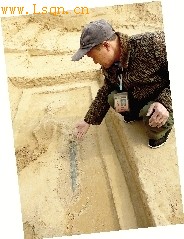 考古发掘工作自3月18日正式开始,截至26日已发掘清理9座墓葬,多为土坑竖穴墓,有一座为空心砖墓。墓葬虽多被盗扰过,但依然出土了一批精美的随葬品。其中,一把青铜剑尤为珍贵,该剑长50厘米,保存十分完整,虽经过2000多年,其刃部依然锋利。郑州市考古研究院专家黄先生告诉记者,从墓葬形制及随葬品初步判断,目前已发掘的9座均为战国时期墓葬。WWw.lSqn.Cn本次出土青铜剑的墓葬位于郑韩故城北,应为战国时期韩国的古墓葬。青铜剑的保存状况和制作工艺又一次印证了文献记载的“天下之强弓劲弩,皆从韩出”的说法(新郑是郑韩故都)。