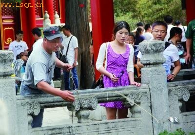 本报昨天报道了男子用磁石敛走“许愿财”,下午,他仍在池边吸金摄/记者 刘汨 昨日下午,在本报《他用磁石敛故宫许愿财》报道刊出后,记者再次探访故宫御花园澄瑞亭发现,原本平常的御花园水池,在“黑导游”的错误讲解下,被打造成“许愿池”。 据知情人透露,吸金人与“黑导游”两者之间存在利益关系,两方一起杜撰许愿池,靠此道敛财。 故宫博物院表示,很早以前就发现这种情况,本报报道后,会开会研讨一个解决方案。 回访 男子继续磁石吸“金” 自称一日游推销员 昨日下午2时,在用磁石吸取硬币情况见报后,记者回访现场发现,此前报道中涉及的戴帽男子,又出现在故宫御花园内千秋亭前。 “我姓王,您明天要去长城玩么?”该名男子告诉记者,老家黑龙江的他,在北京[注: 北京有着三千余年的建城史和八百五十余年的建都史,最初见于记载的名字为“蓟”。民国时期,称北平。新中国成立后,是中华人民共和国的首都,]的“主业”是推销市内的一日游线路。在故宫内,也确实有很多和他一样从事类似线路推销的人。 下午3点,园内游客渐少,该名男子又站在了水池旁,用力一掷,随着“啪”的一声,吸满硬币的磁石被从水中拉出。wwW.LSqn.cn 见自己的“生财之路”被记者撞个正着,男子也不好再多做掩饰。但他解释说,池中的硬币反正早晚都要被捞上来,一边说着,男子一边让[注: 人物边让 简介终属 东汉 官至 九江太守 [公元?年-二0 八年]字文礼,陈留浚仪人。生年不详,卒于汉献帝建安中。少辩博能文。]同伴将吸满硬币的磁石拿到了别处。 “吸金”男子称,其吸金所用的磁石为强磁,因而才能轻而易举地将水中的硬币吸附上来。磁石购买的地点就在西四附近的五金店,价格不到百元。 男子告诉记者,每日他差不多要进行三次磁石吸金,每次下去至少能吸到六七十元钱,一天下来,至少也能吸个两三百元。 他同时称,虽然园内从事市内旅游线路推荐的有不少人,但并非所有人都兼做磁石吸金的副业,每次分钱的范围也就局限在三四人之内。“就是我们哥几个分一下。” 男子还表示,虽然每天的目标是将池内的硬币“一网打尽”,但因怕连续吸金太吸引工作人员注意,所有只敢分成几次进行。 揭秘 “黑导”编出“许愿池” 双方一起敛财 故宫博物院官网上显示,澄瑞亭为明代所建。据《明宫史》记载,1583年修宫后苑处时,园中已有“东西鱼池,池上二亭,左曰浮碧,右曰澄瑞”。明代在宫后苑中开挖池子,蓄水养鱼,用以弥补宫中花园没有水源的缺憾。桥上建亭,是为观鱼游憩所设。 在一些“个体”导游的错误讲解下,养鱼池误传成了许愿池。 在两次探访时,记者刚步入故宫,就有十多人涌过来询问是否需要“导游服务”。但工作人员表示,正规所属故宫导游都佩戴统一的工作证件,而且是在故宫外专门的地点聘用。 虽然这些个体导游不少都佩戴有“导游证”,但据知情人透露,这当中一些人确实通过了资格考试,另一些人实际上并没有导游资质。 昨 [1] [2] 下一页