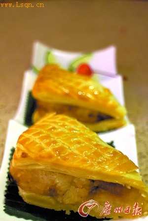 卖相很洋气,十足十西式、港式点心模样,上下两层微甜松软的酥皮,夹着软糯的内馅,让平淡的裹蒸粽带了牛油香,口感丰富。wWW.LsqN.CN看来,中国传统食品披上洋外衣,确实会另有一番新情趣。这个创意来自酥皮龙虾汤,上面铺的那一层酥皮,厨师用来裹粽子。酥皮的原料是面粉、鸡蛋、牛油。这个不用预先蒸,直接放在炉里焗,因为炉子里温度足够高,酥皮一层一层就会自然出层次。